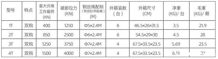 采用高强度钢板,优质碳钢的一体结构,搭配高密度齿轮,防逆转设计理念碳钢套压制钢丝绳安全系数大大提升。