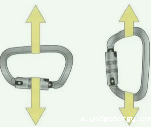 安全钩是一个小型的锁闭装置,它有主轴和次轴两个部位,主轴负责承重,次轴负责锁紧,当荷载落在主轴、次轴不同部位上时,钩子的承重能力是不同的,因此我们连接钩子时,一定要注意钩子的开口方向。